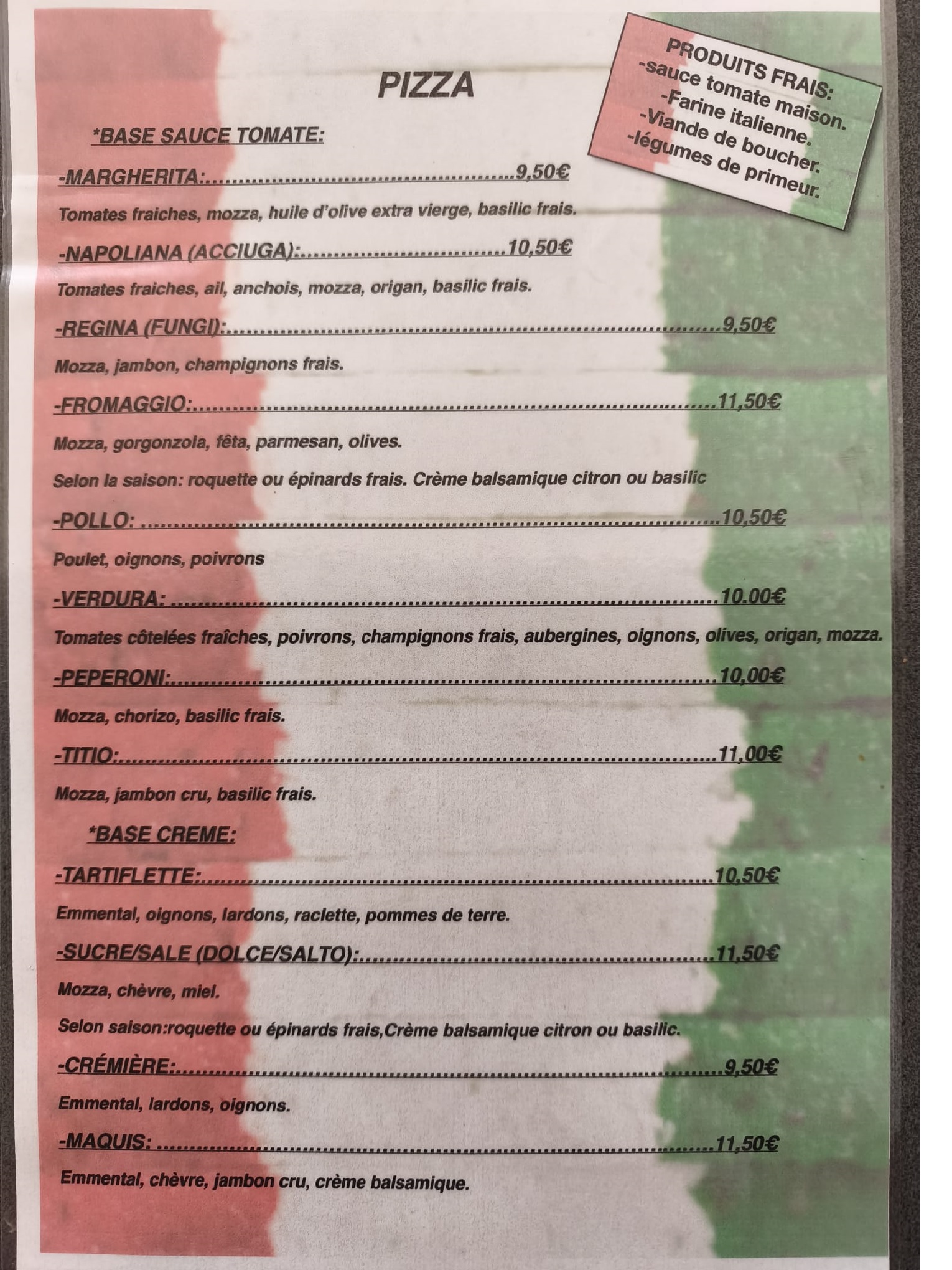 Une sauce tomate maison, une farine italienne Caputo, des légumes frais du primeur, une viande bouchère de qualité, des produits locaux(miel,....)Notre équipe accueillante vous servira le meilleur de la restauration rapide, des plats maison et des spécialités traditionnelles. Laissez-vous tenter par nos délicieuses pizzas ! Nous nous adaptons à tous les régimes alimentaires et proposons un large choix de plats halal et végétariens. Dans un cadre calme et relaxant, prenez une bonne pizza et degustez la tranquillement chez vous !